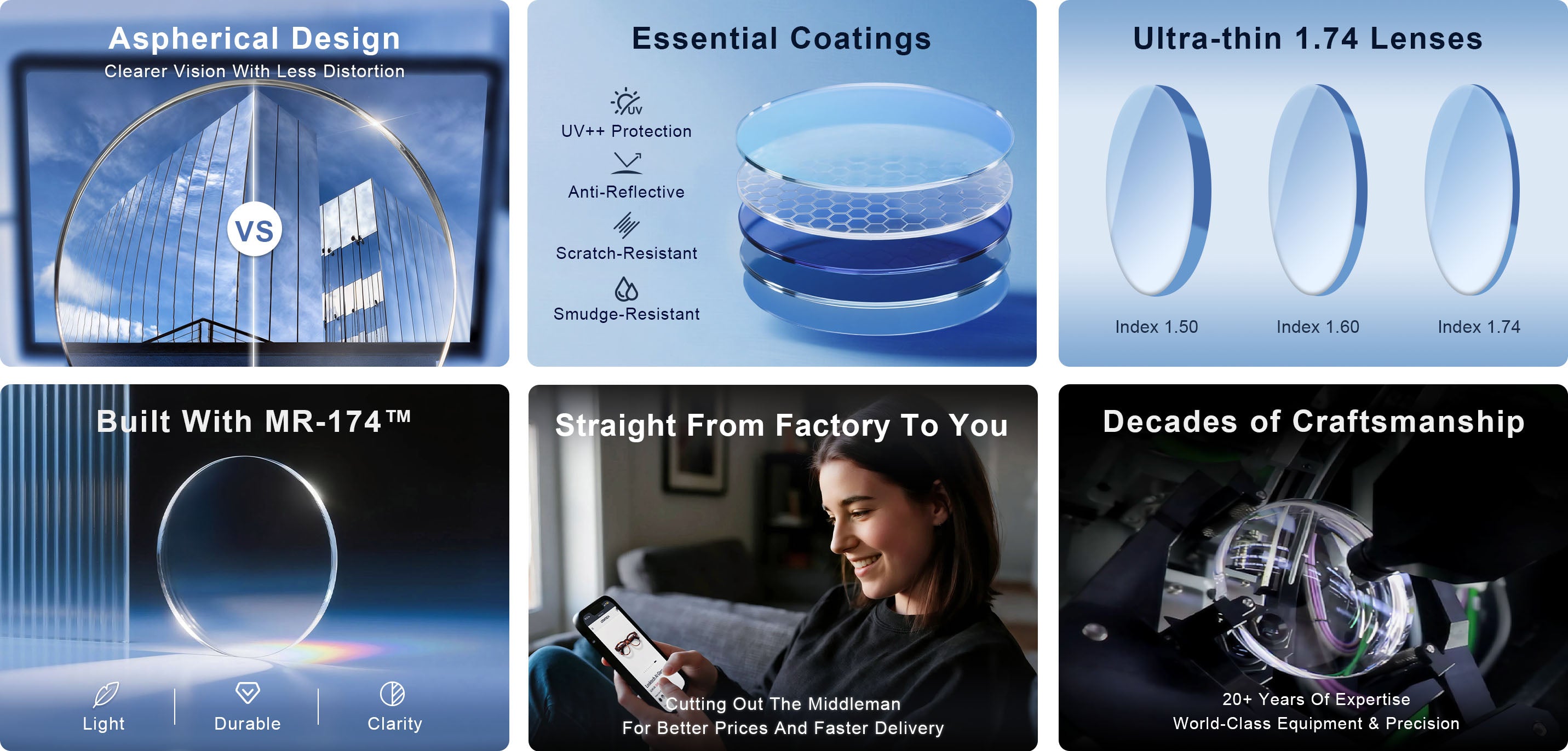Decades of expertise, premium MR-174™ materials, and essential coatings come together to create lenses that are thinner, stronger, and clearer — without the middleman markup.