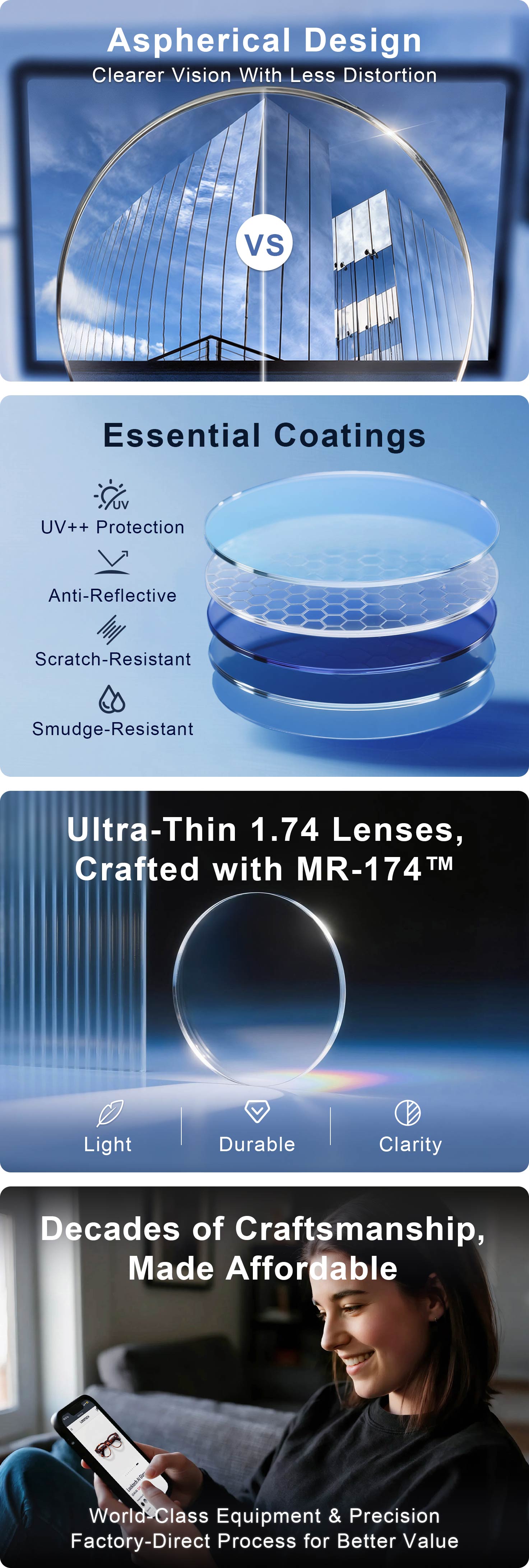 Decades of expertise, premium MR-174™ materials, and essential coatings come together to create lenses that are thinner, stronger, and clearer — without the middleman markup.